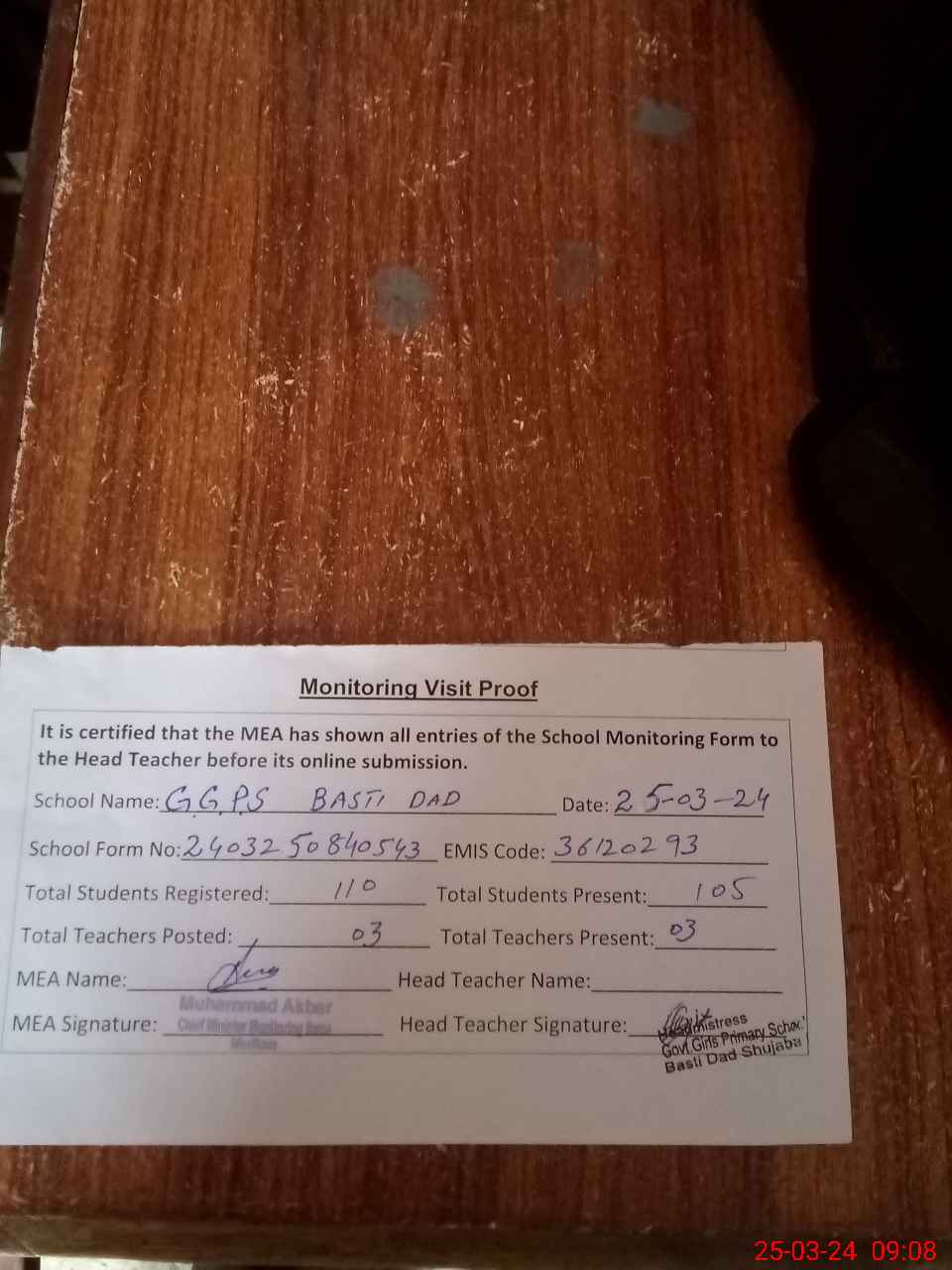 | EMIS Code: 36120293 | Name of School: GGPS BASTI DAD SHUJABAD MULTAN | |||