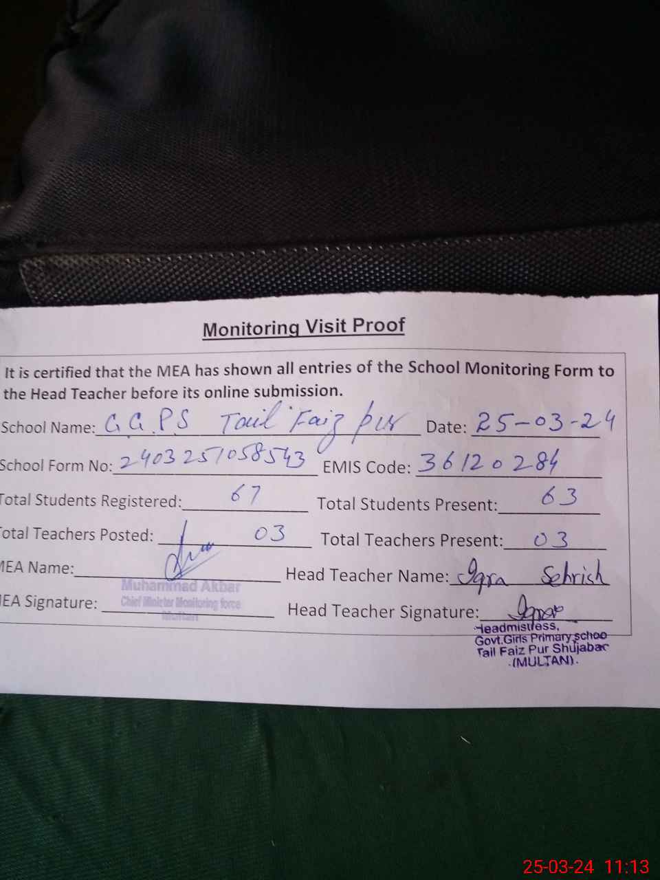 | Name: Ai**** Me**** Designation: (School Headmaster's/Headmistress's) HEADMISTRESS Phone/Cell Number: 03**** |