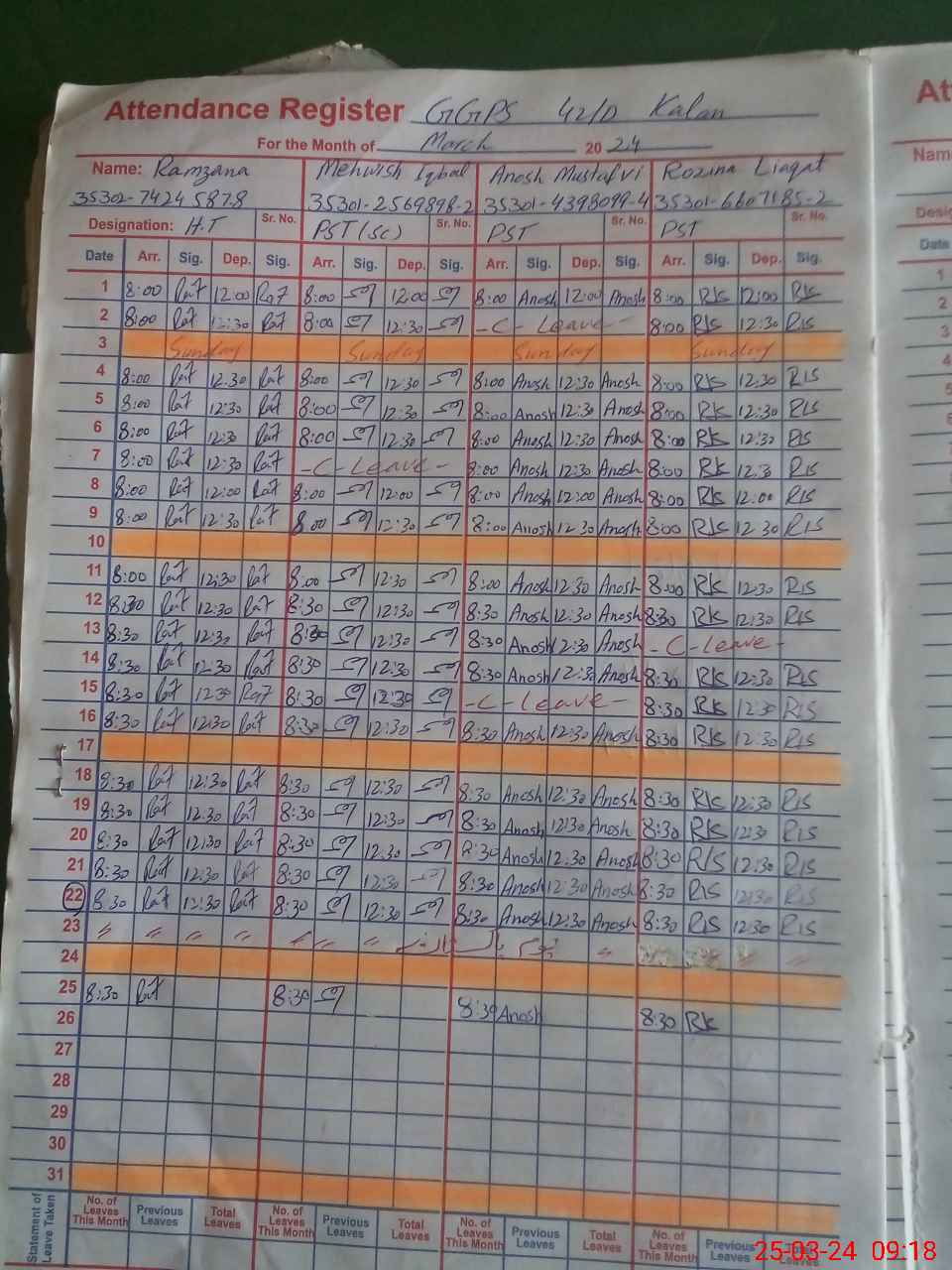 | CNIC | Full Name | Designation | R/C | Absence During Last Calender Month |