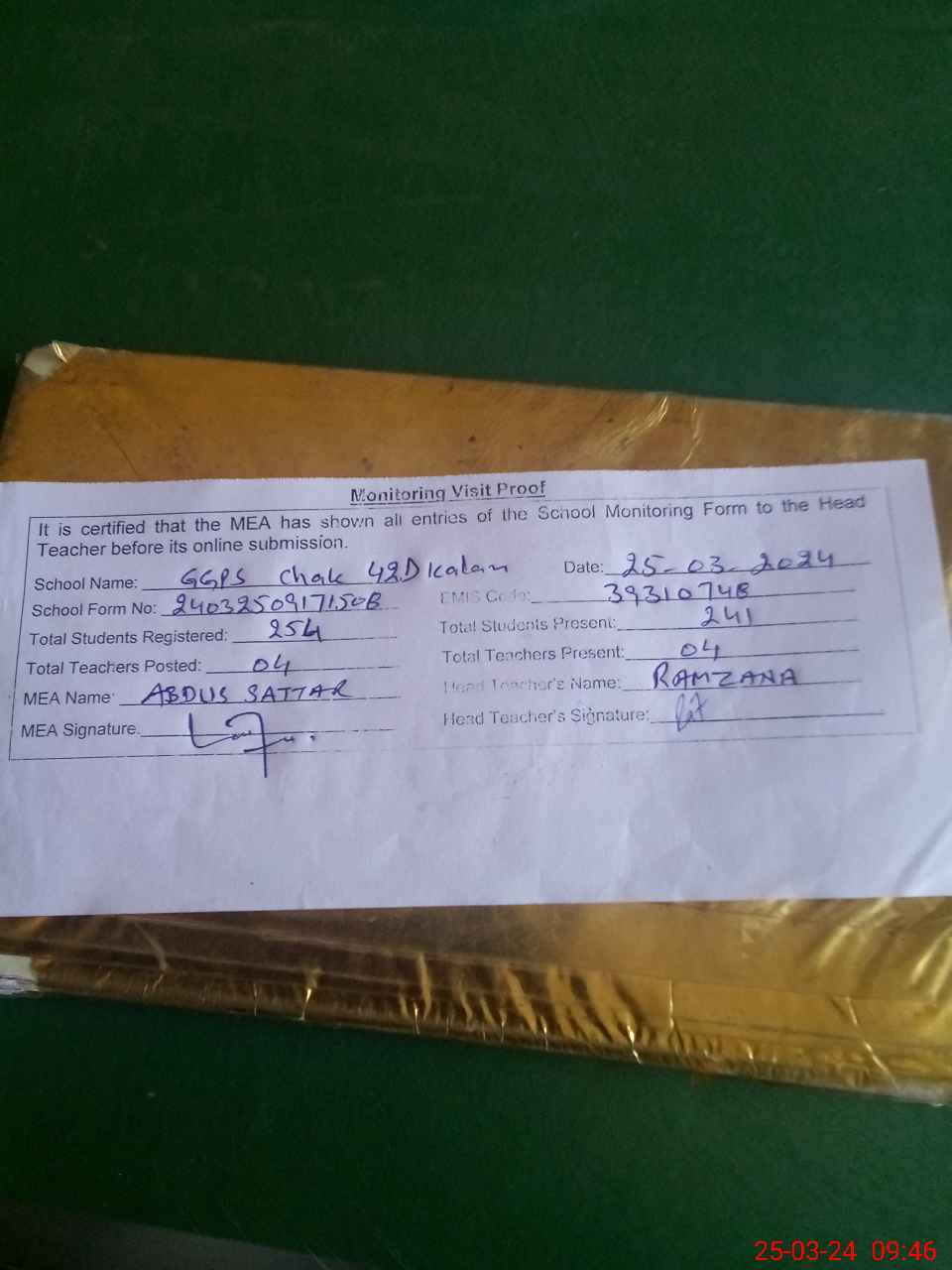 | Attendance Register | Head Teacher | MEA with School | Visit Proof |