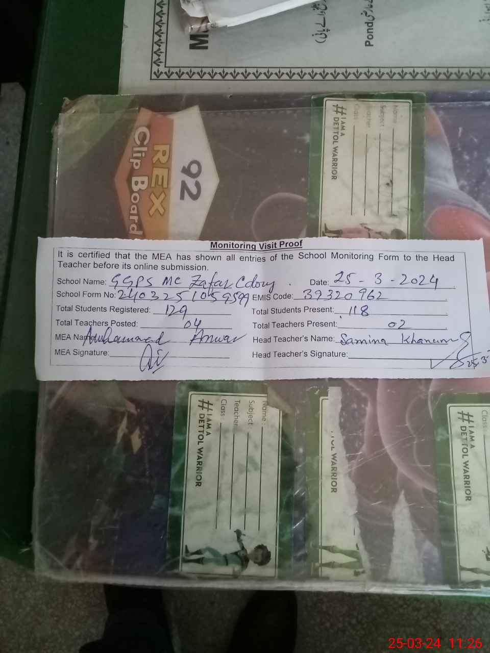 | Attendance Register | Head Teacher | MEA with School | Visit Proof |