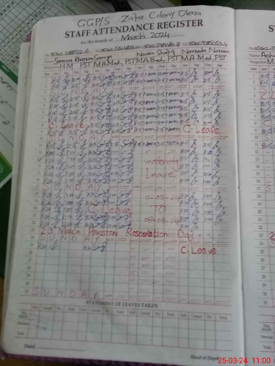 | Leave | Duty | Absent | Maternity | Medical | Ex- Pak |