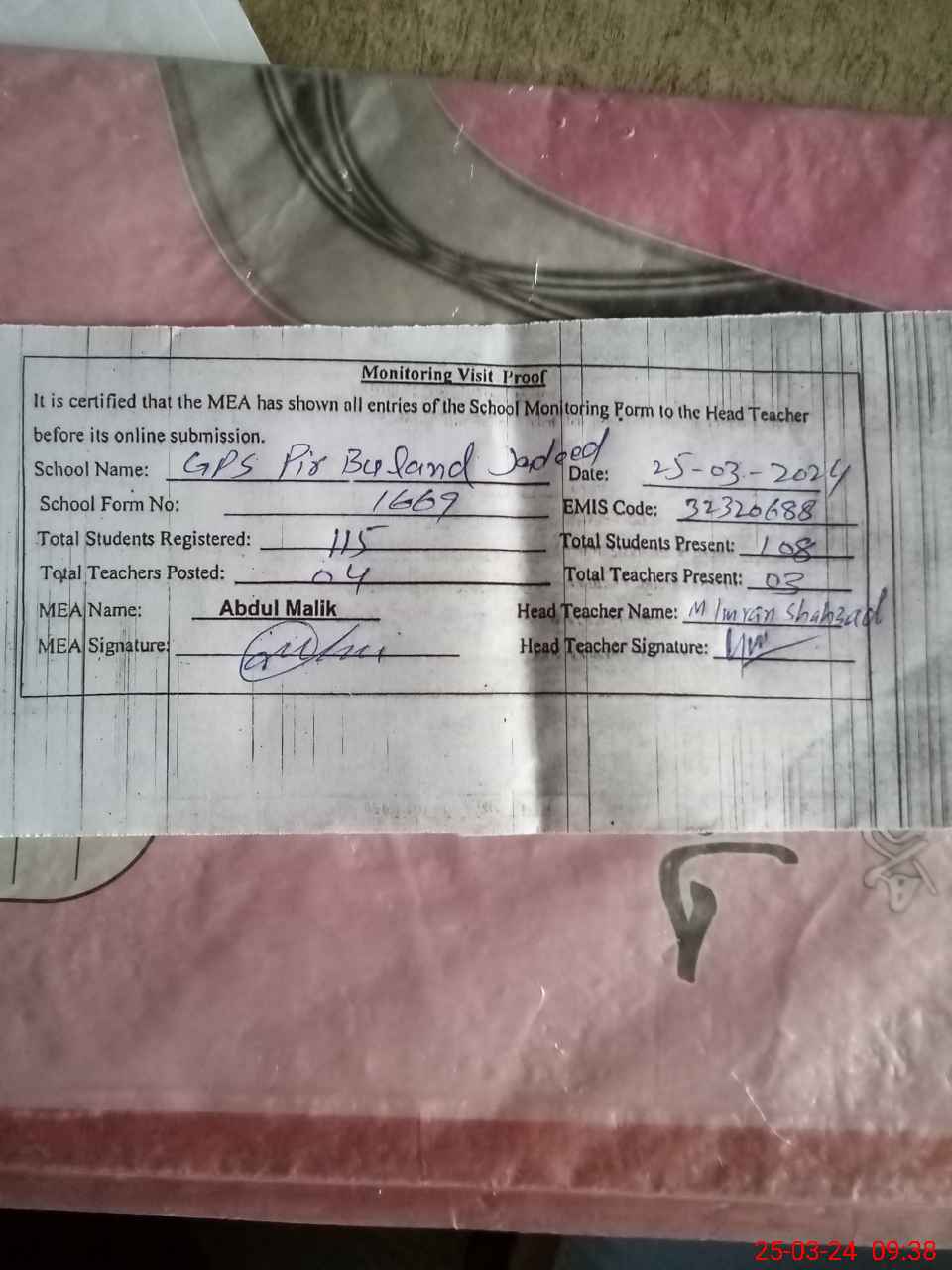| EMIS Code: 32320688 | Name of School: GPS PIR BULAND JADEED | |||