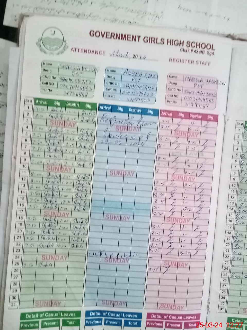 | CNIC | Full Name | Designation | R/C | Absence During Last Calender Month |
