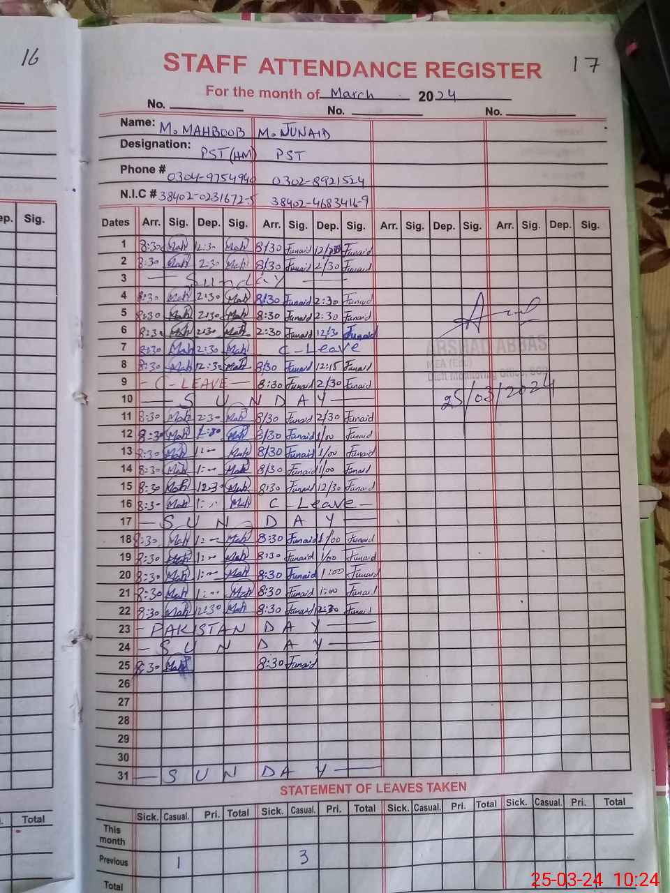 | CNIC | Full Name | Designation | R/C | Absence during last cal. month |