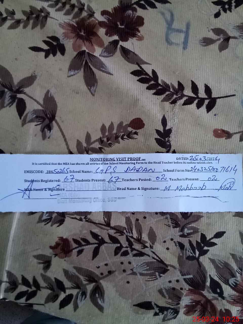 | Certified that this School was Inspected by the Undersigned MEA/DMO Today and the Information Stated Above is as Per Record. | |||||