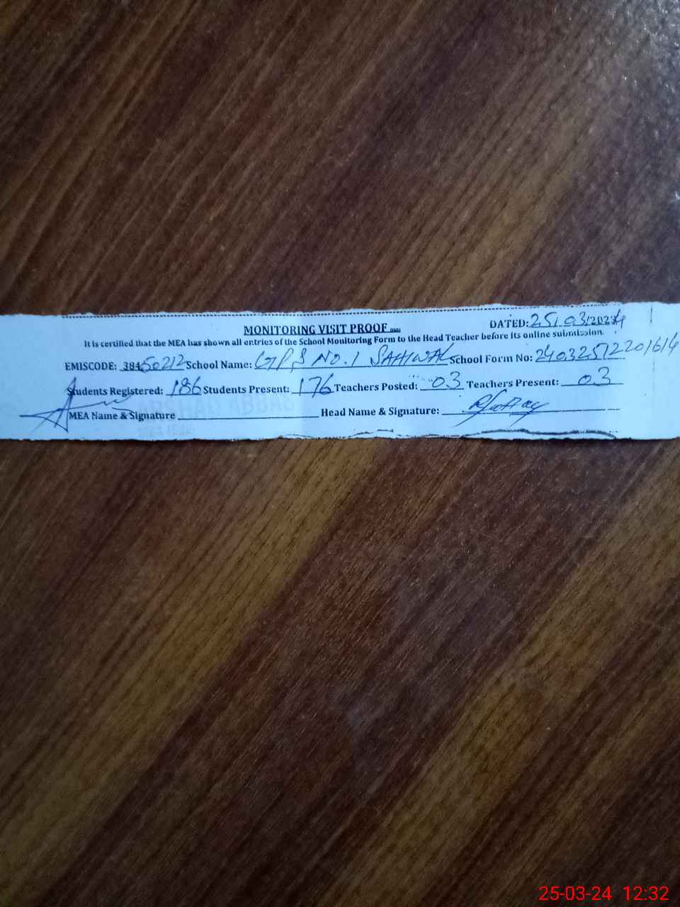 | Attendance Register | Head Teacher | MEA with School | Visit Proof |