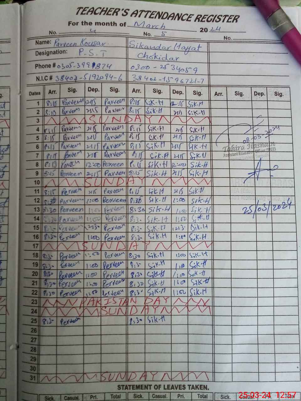 | Name: SA**** KA**** Designation: (School Headmaster's/Headmistress's) PST Phone/Cell Number: 03**** |
