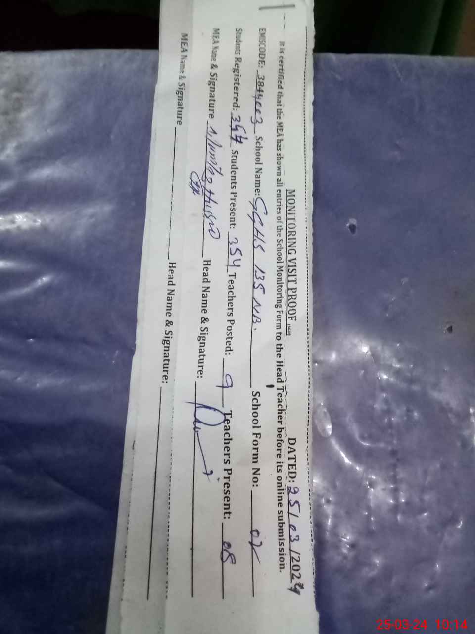 | Certified that this School was Inspected by the Undersigned MEA/DMO Today and the Information Stated Above is as Per Record. | |||||