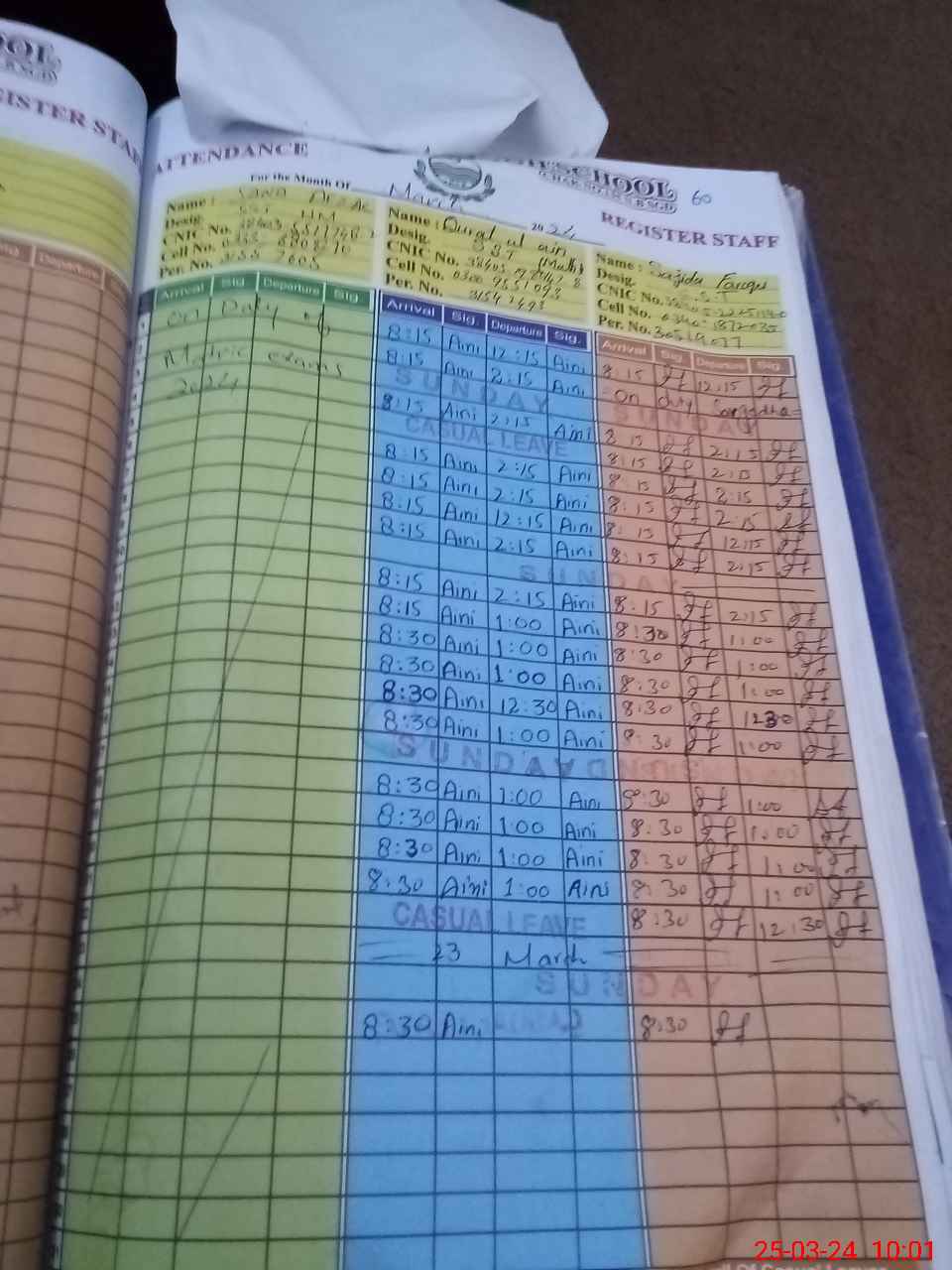 | CNIC | Full Name | Designation | R/C | Absence during last cal. month |
