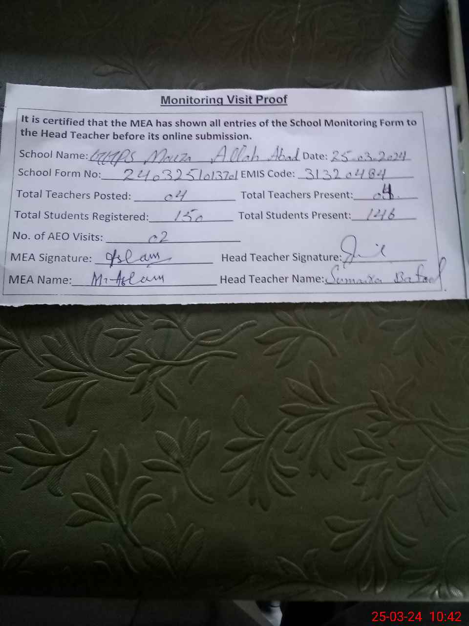 | Attendance Register | Head Teacher | MEA with School | Visit Proof |