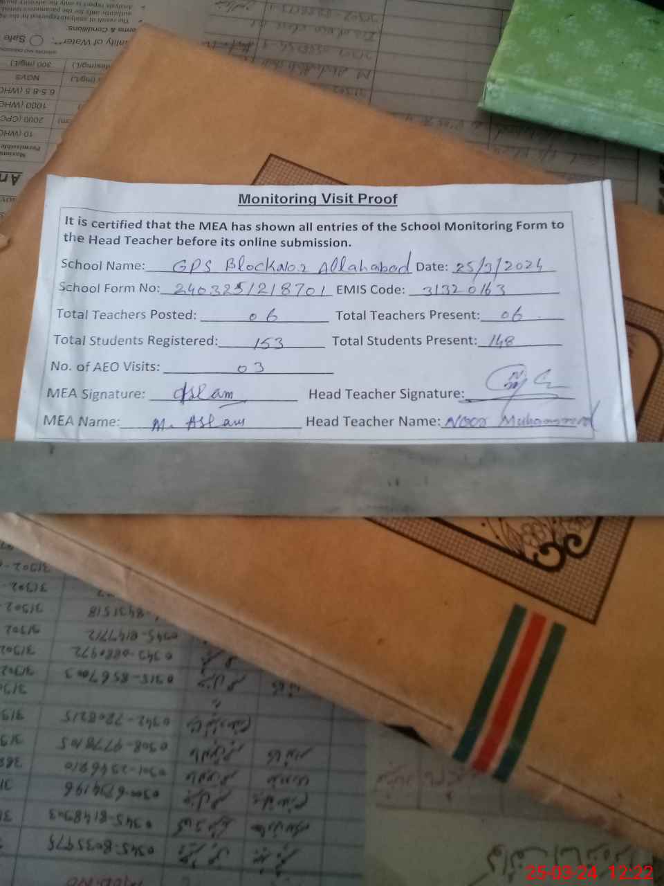 | Attendance Register | Head Teacher | MEA with School | Visit Proof |