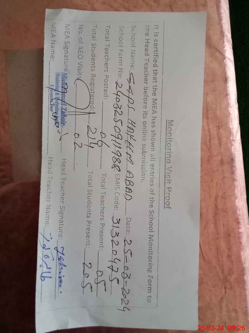 | Certified that this School was Inspected by the Undersigned MEA/DMO Today and the Information Stated Above is as Per Record. | |||||
