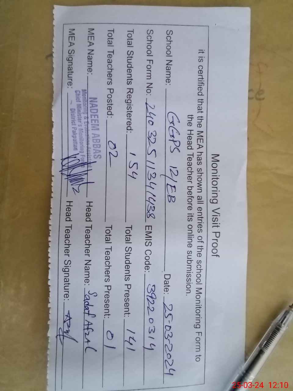 | Attendance Register | Head Teacher | MEA with School | Visit Proof |