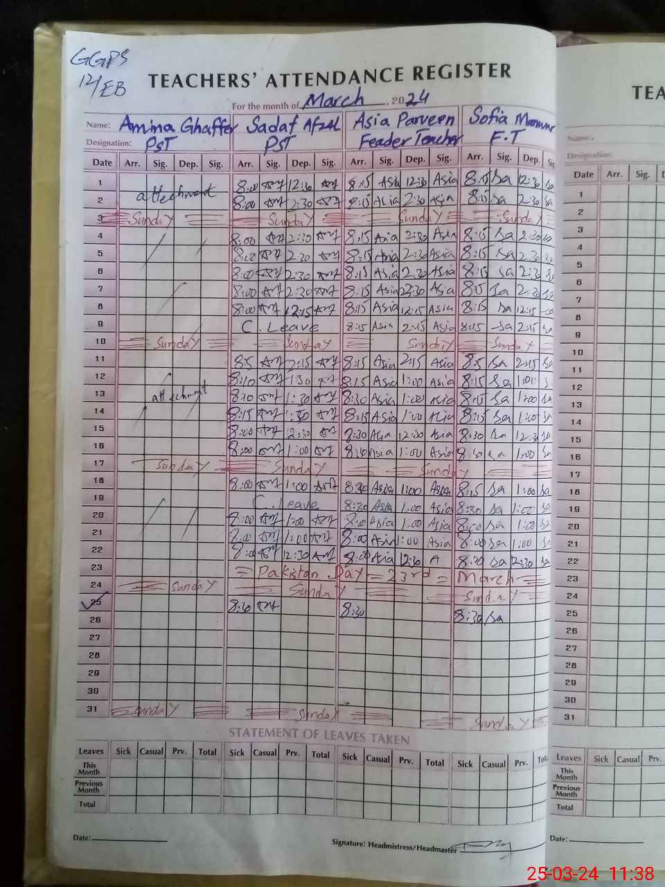 | Remarks (Use Separate Page if Required): Note Head teacher Amna Ghaffar PST was found absent without leave she was shown on additional duty without fresh official letter | |||||