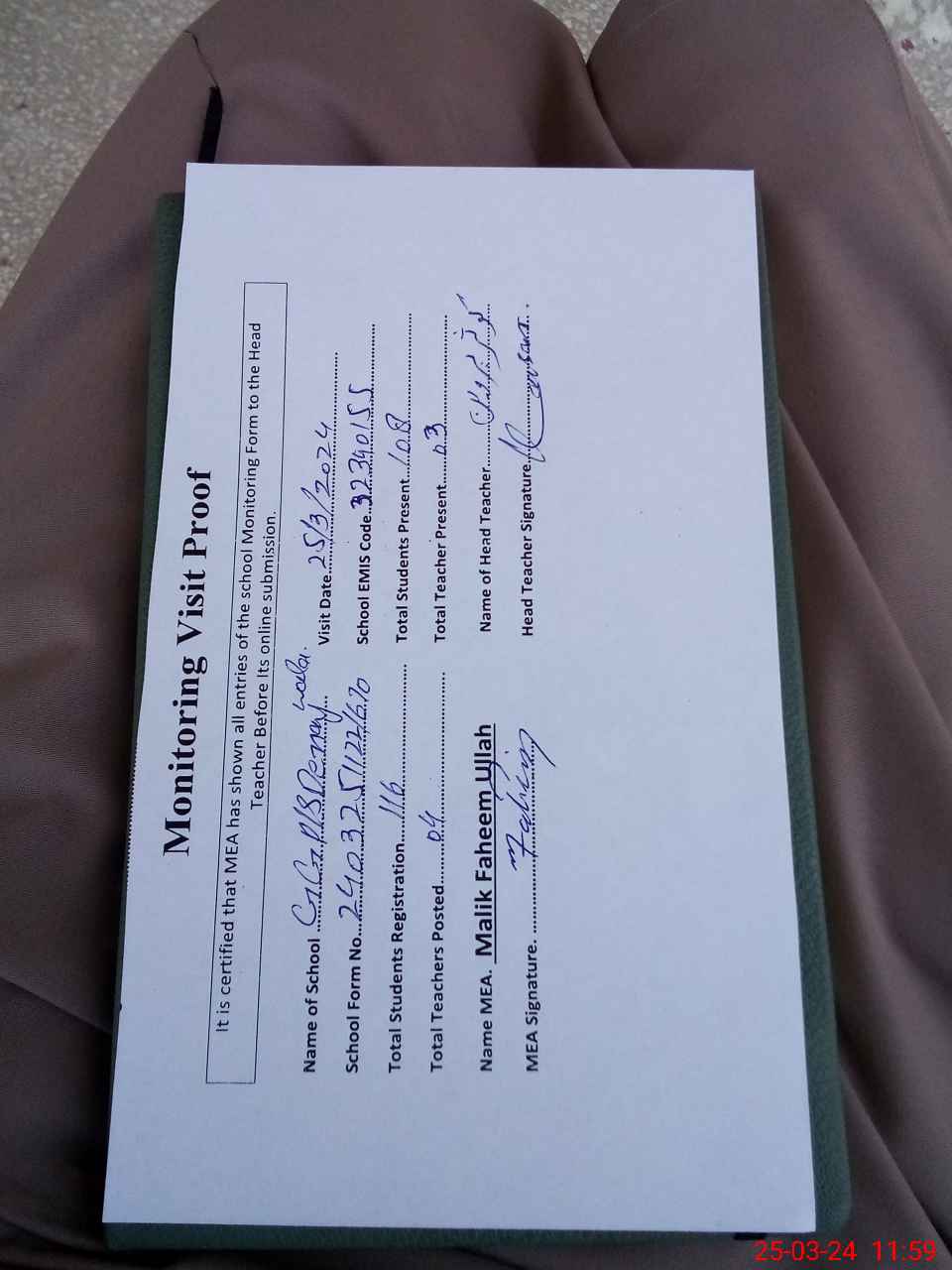 | Attendance Register | Head Teacher | MEA with School | Visit Proof |