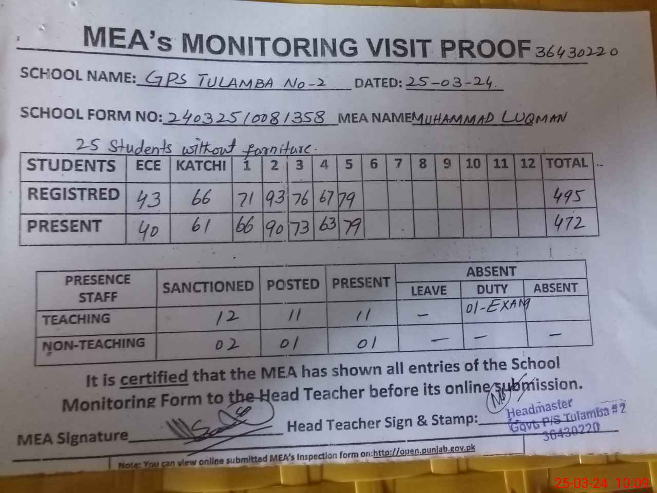 | Attendance Register | Head Teacher | MEA with School | Visit Proof |
