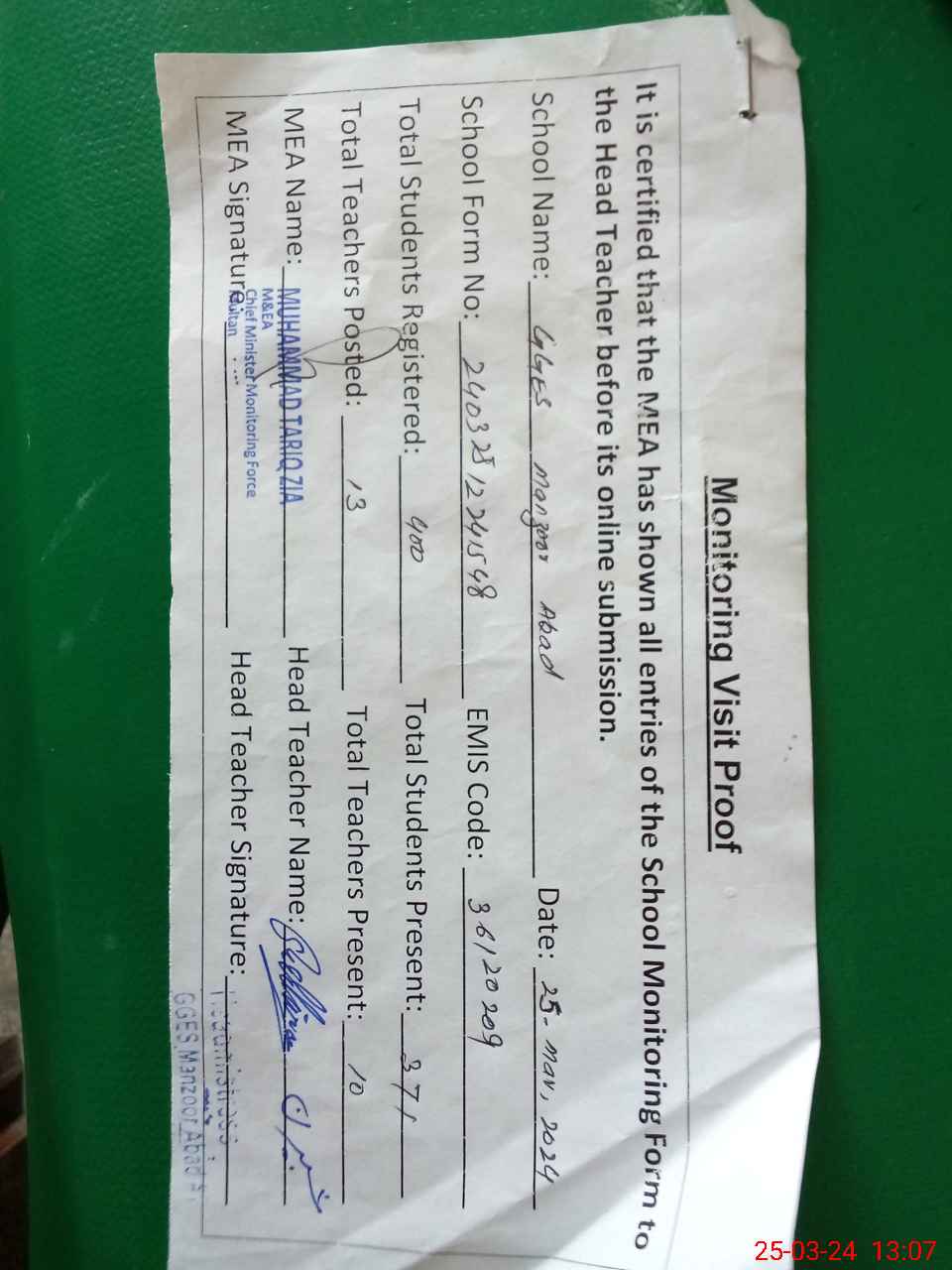 | Certified that this School was Inspected by the Undersigned MEA/DMO Today and the Information Stated Above is as Per Record. | |||||