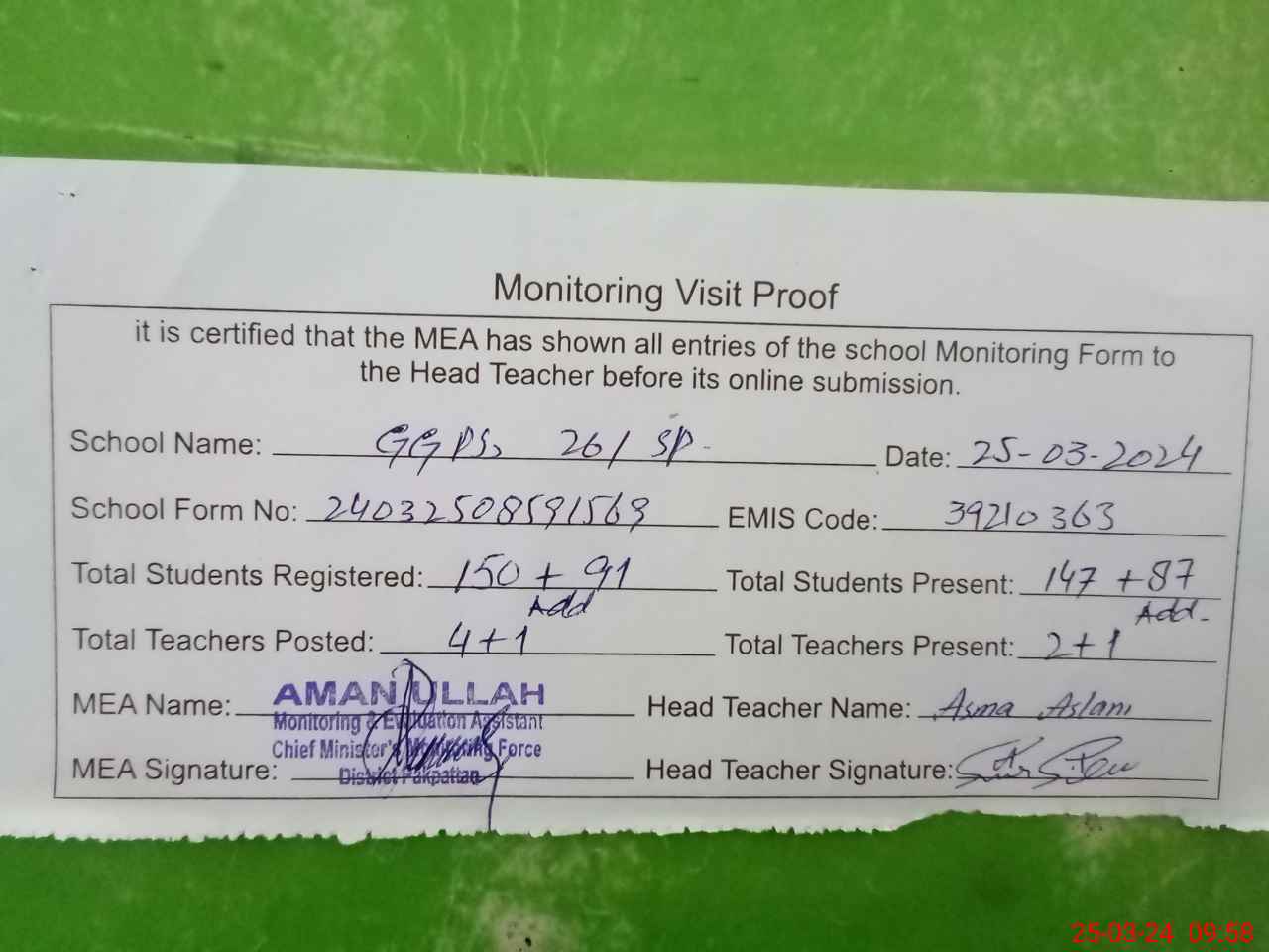 | Certified that this School was Inspected by the Undersigned MEA/DMO Today and the Information Stated Above is as Per Record. | |||||