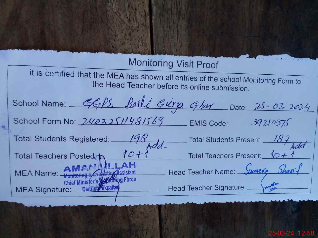 | Attendance Register | Head Teacher | MEA with School | Visit Proof |