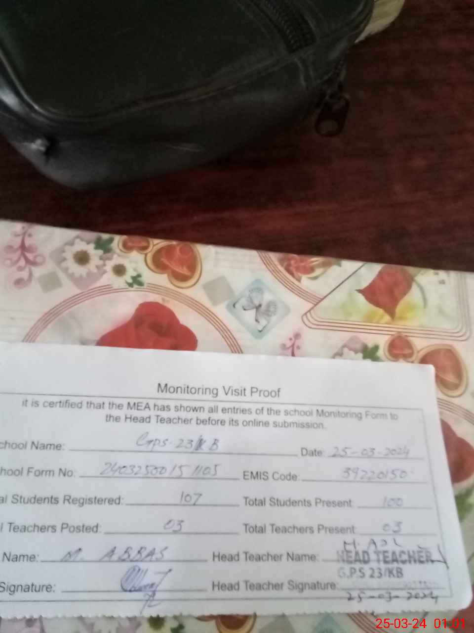 | EMIS Code: 39220150 | Name of School: GPS CHAK NO. 23 KB | |||
