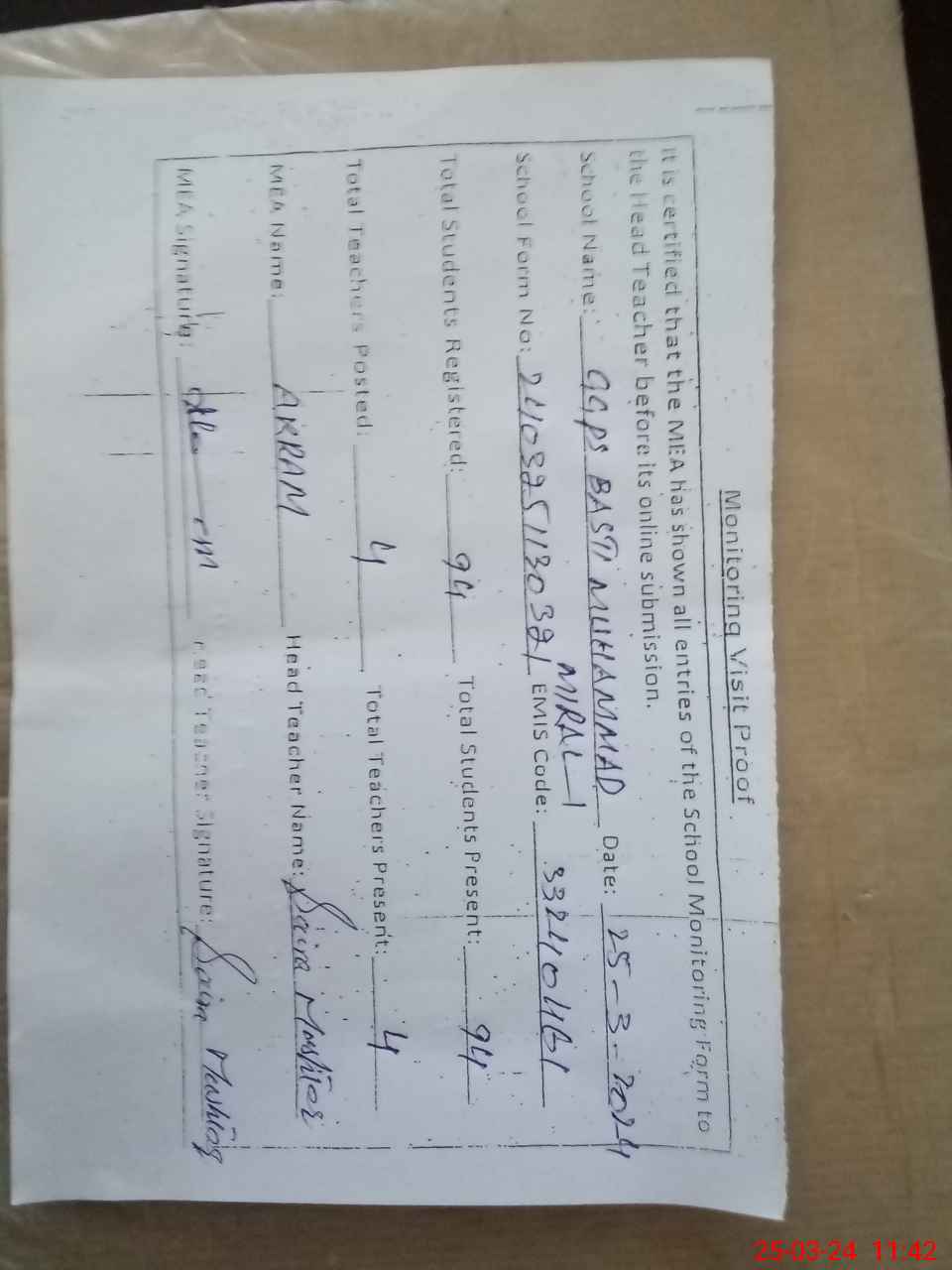 | Attendance Register | Head Teacher | MEA with School | Visit Proof |