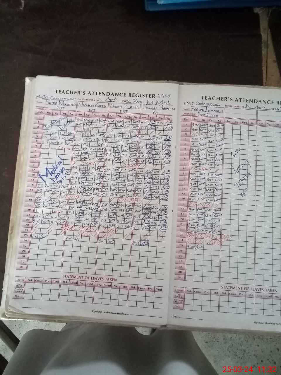 | Leave | Duty | Absent | Maternity | Medical | Ex- Pak |