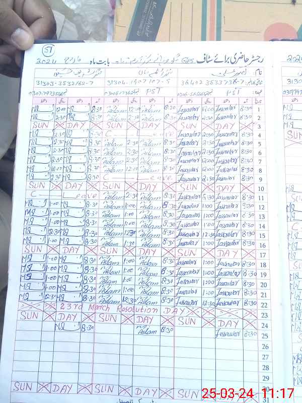 | CNIC | Full Name | Designation | R/C | Absence During Last Calender Month |