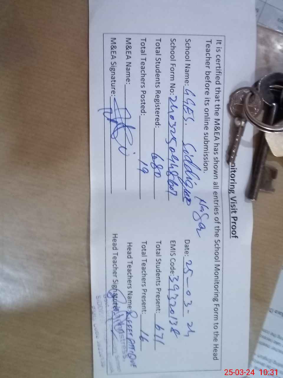 | Attendance Register | Head Teacher | MEA with School | Visit Proof |