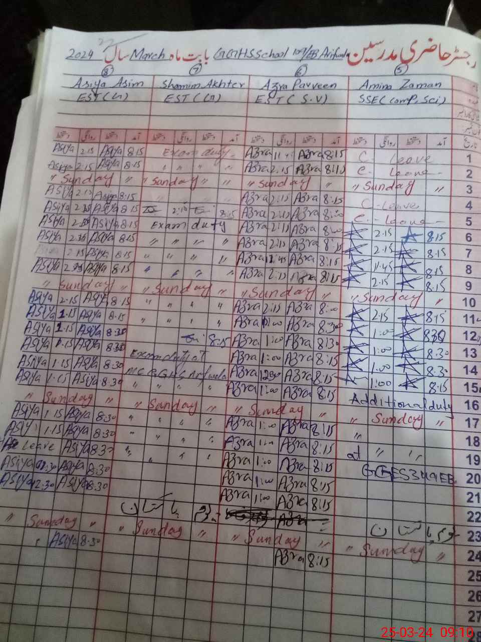 | 36**** | Sh**** Ak**** | 1 | 2 | 1 | 0 | 0 | 0 | 0 | 0 | 0 | 2 | Exam Duty | |