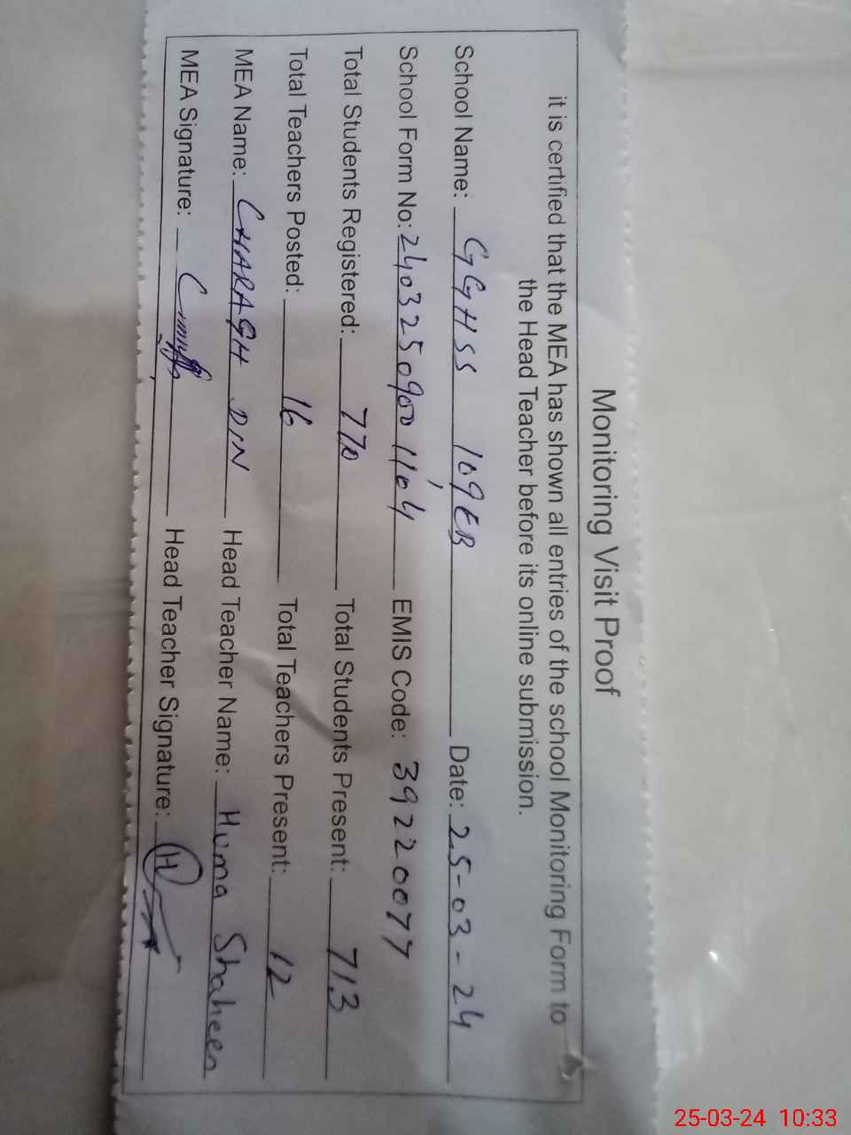 | Attendance Register | Head Teacher | MEA with School | Visit Proof |