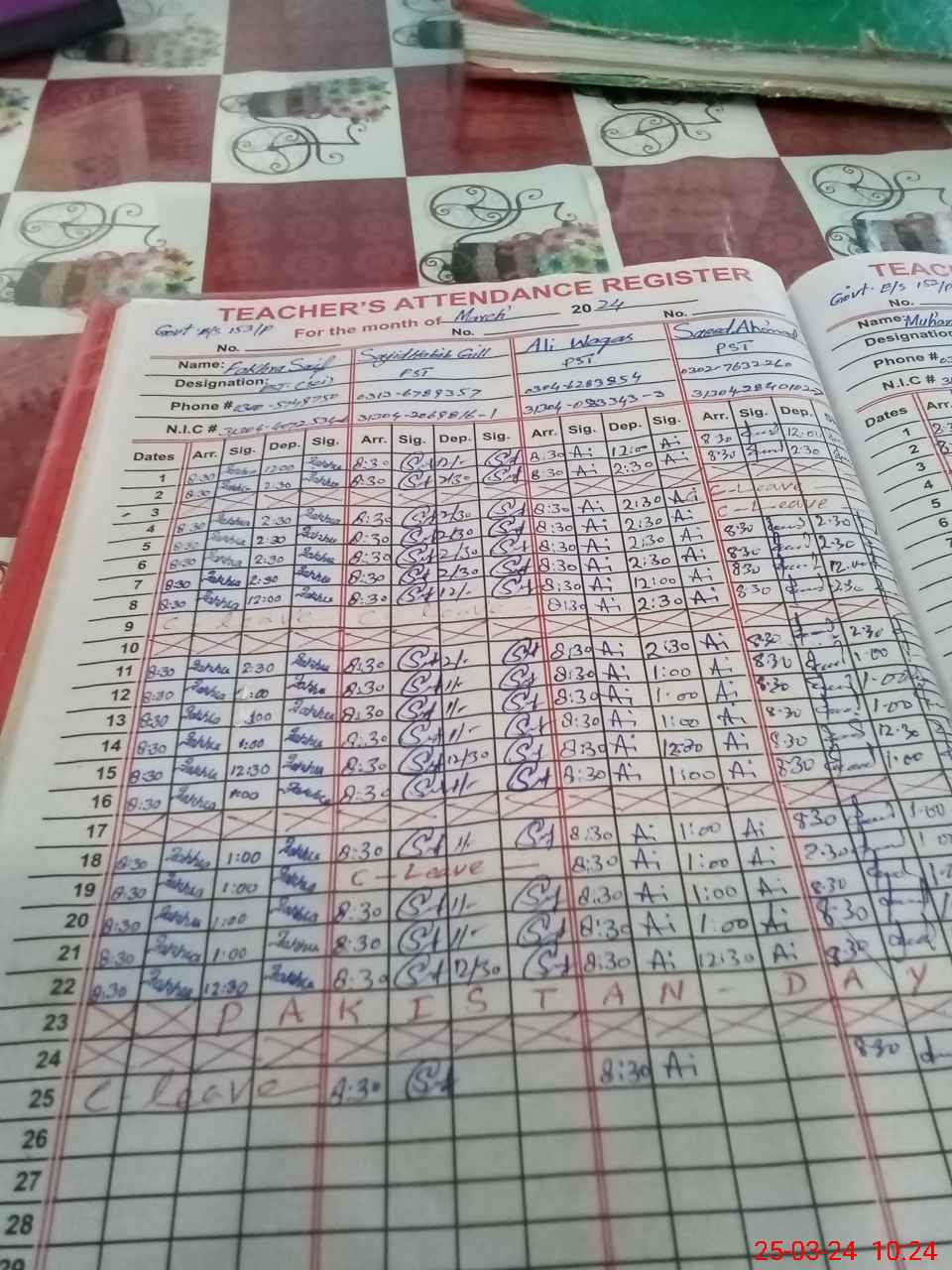 | CNIC | Full Name | Designation | R/C | Absence during last cal. month |