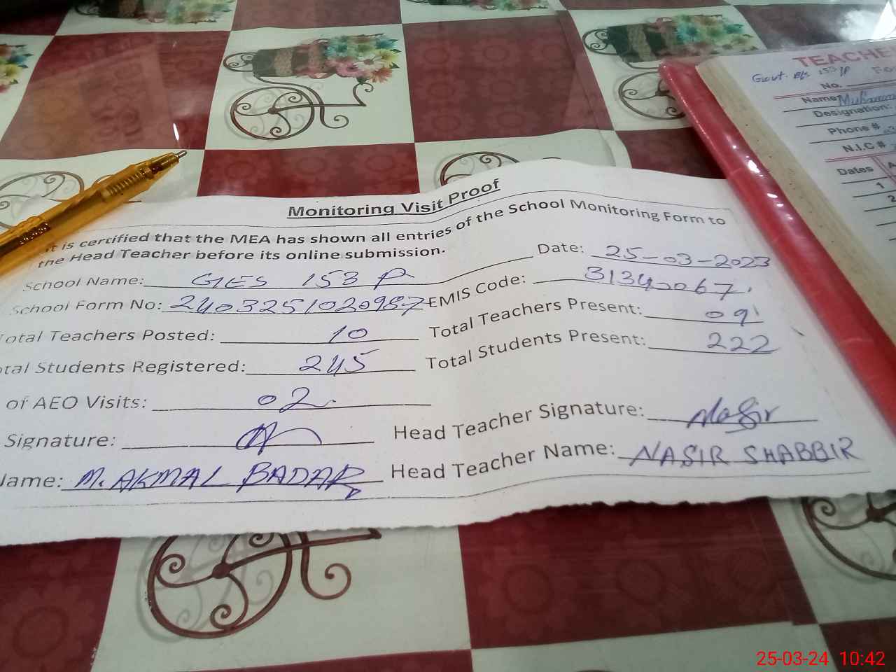 | Attendance Register | Head Teacher | MEA with School | Visit Proof |