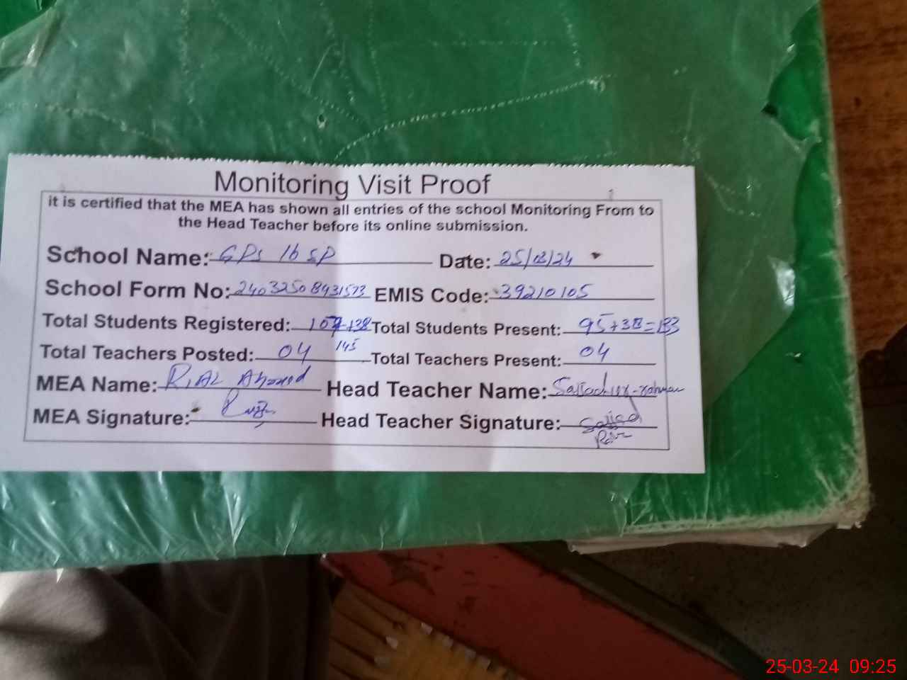 | Attendance Register | Head Teacher | MEA with School | Visit Proof |