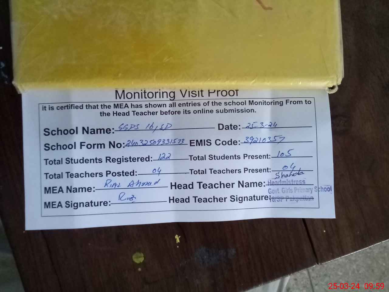 | Attendance Register | Head Teacher | MEA with School | Visit Proof |