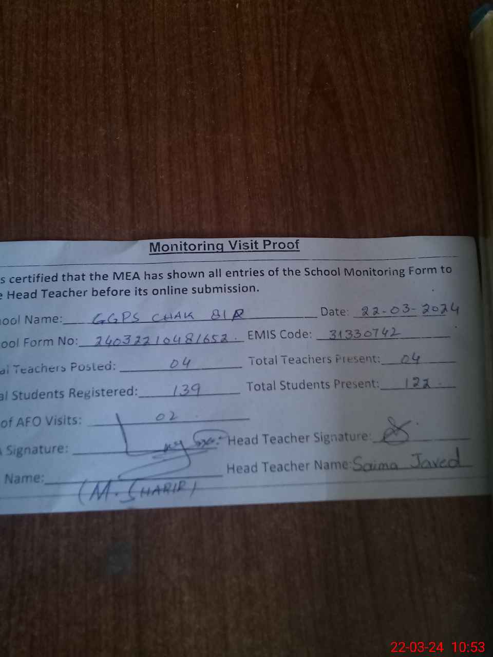 | Attendance Register | Head Teacher | MEA with School | Visit Proof |