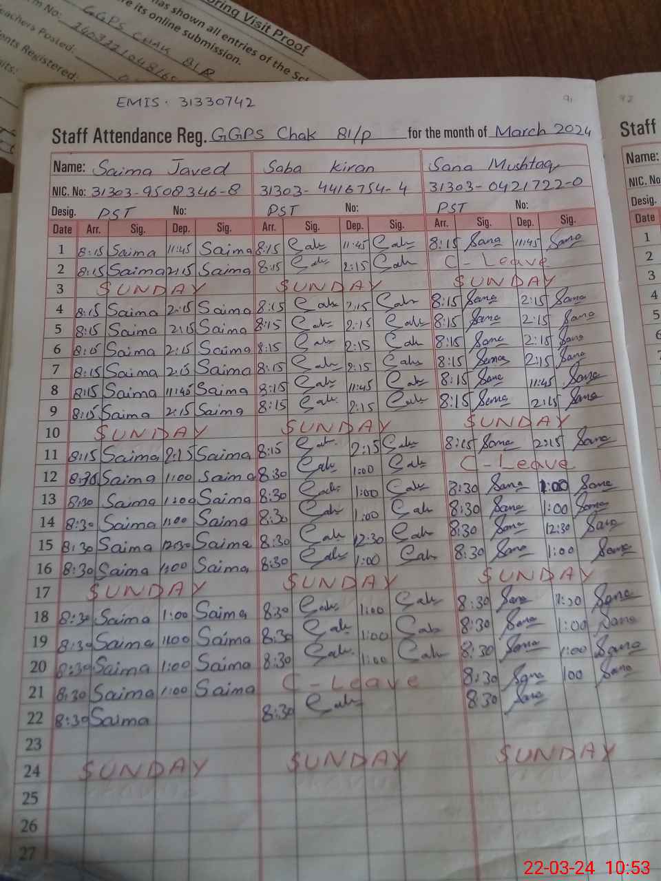 | CNIC | Full Name | Designation | R/C | Absence During Last Calender Month |