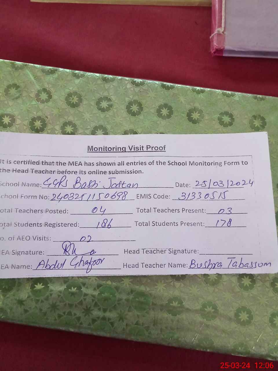 | Certified that this School was Inspected by the Undersigned MEA/DMO Today and the Information Stated Above is as Per Record. | |||||