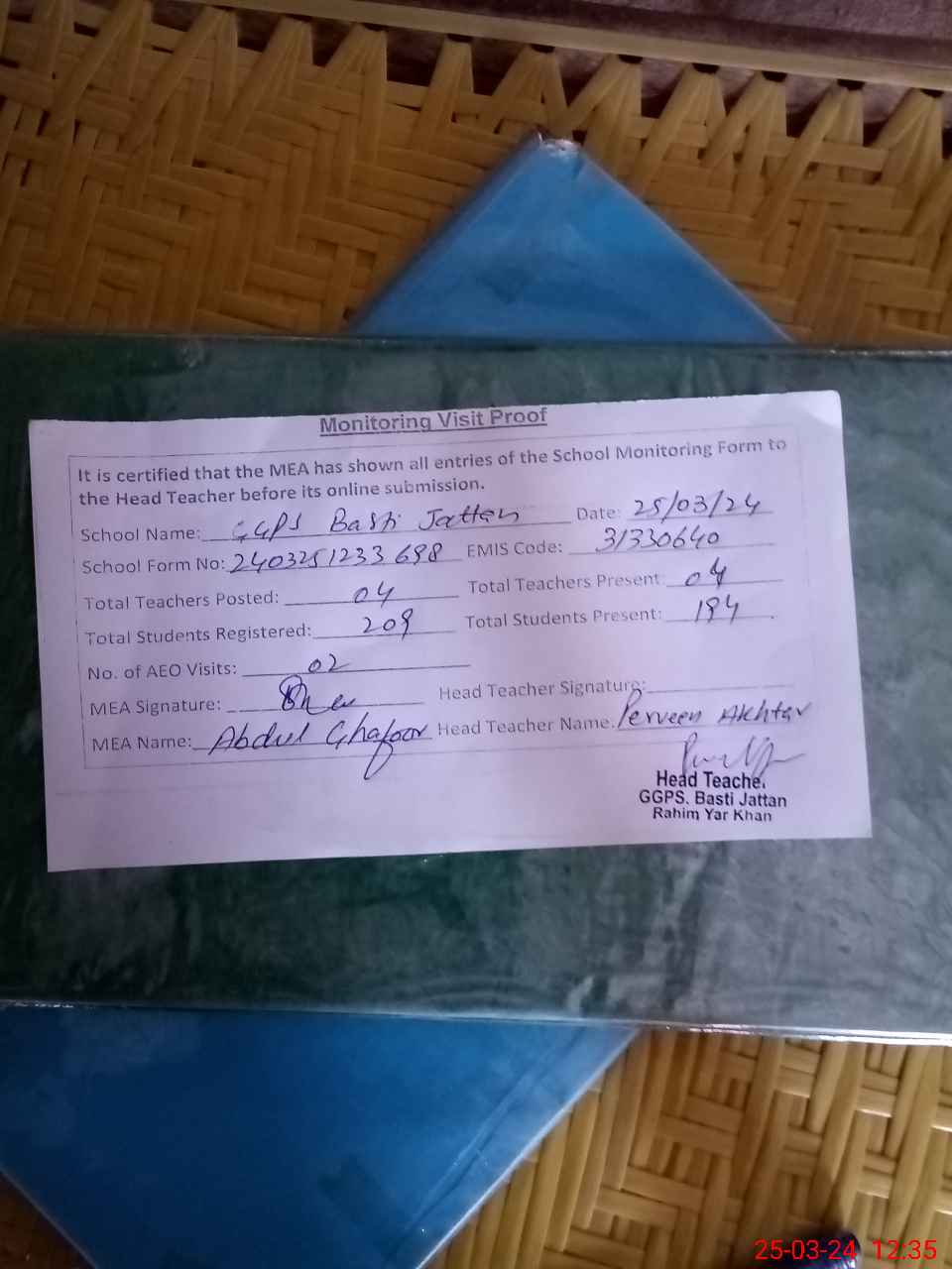 | EMIS Code: 31330640 | Name of School: GGPS BASTI JATTAN R.Y.KHAN (Basti Burra) | |||