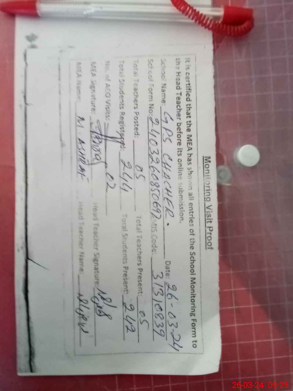 | Attendance Register | Head Teacher | MEA with School | Visit Proof |