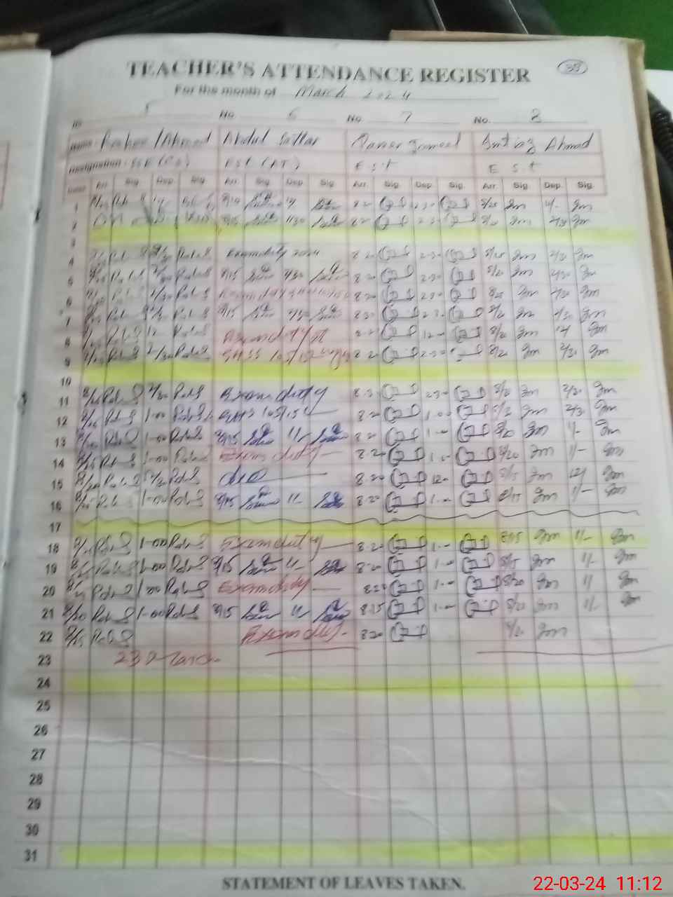 | 36**** | Ab**** Sa**** | 1 | 2 | 0 | 0 | 0 | 0 | 0 | 0 | 0 | 2 | Exam Duty | |