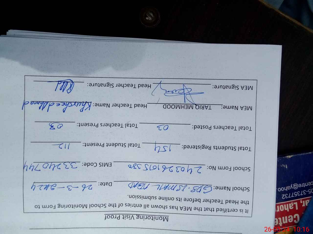| Certified that this School was Inspected by the Undersigned MEA/DMO Today and the Information Stated Above is as Per Record. | |||||