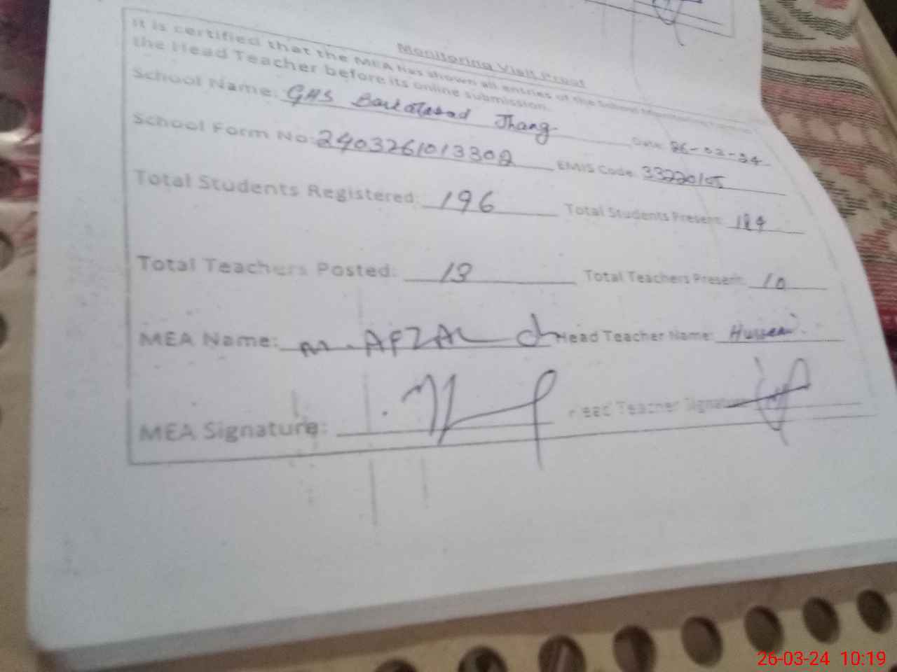 | Certified that this School was Inspected by the Undersigned MEA/DMO Today and the Information Stated Above is as Per Record. | |||||
