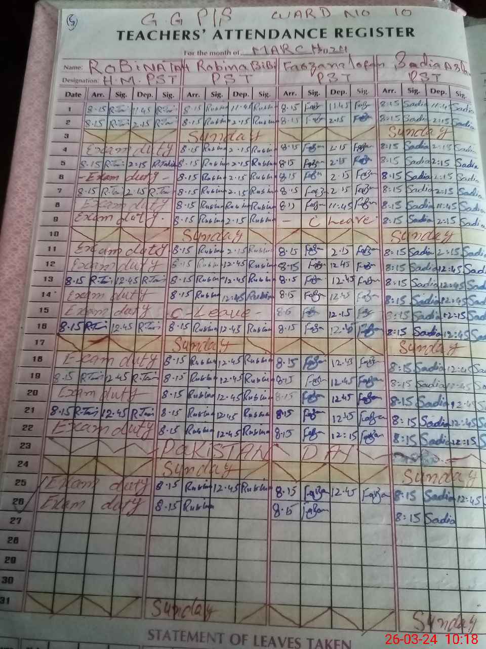 | Leave | Duty | Absent | Maternity | Medical | Ex- Pak |