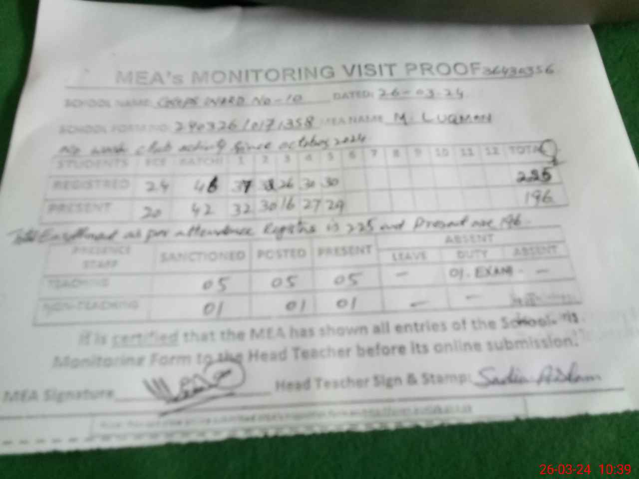 | Certified that this School was Inspected by the Undersigned MEA/DMO Today and the Information Stated Above is as Per Record. | |||||