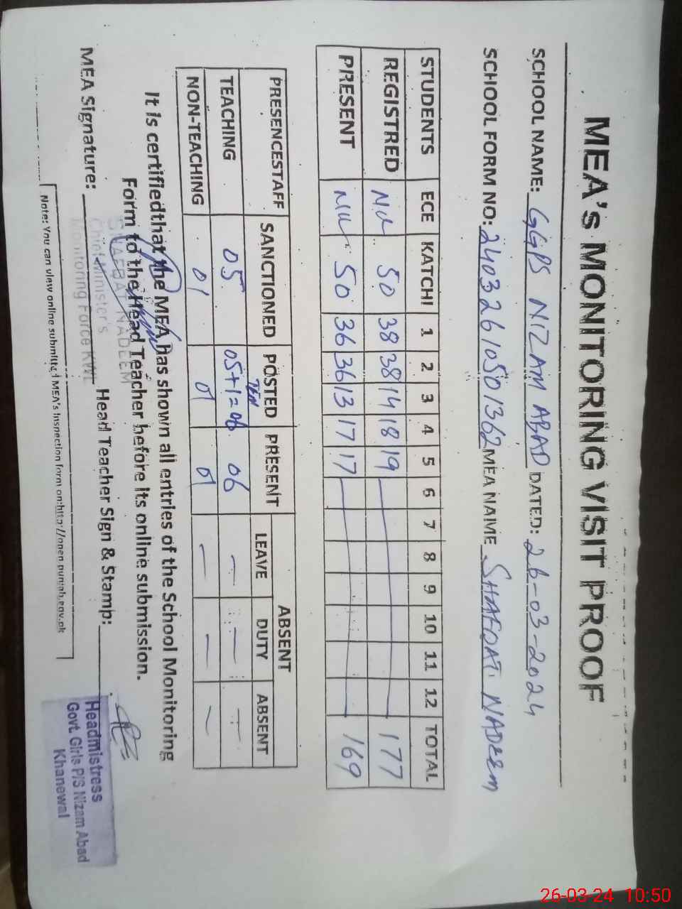 | Attendance Register | Head Teacher | MEA with School | Visit Proof |