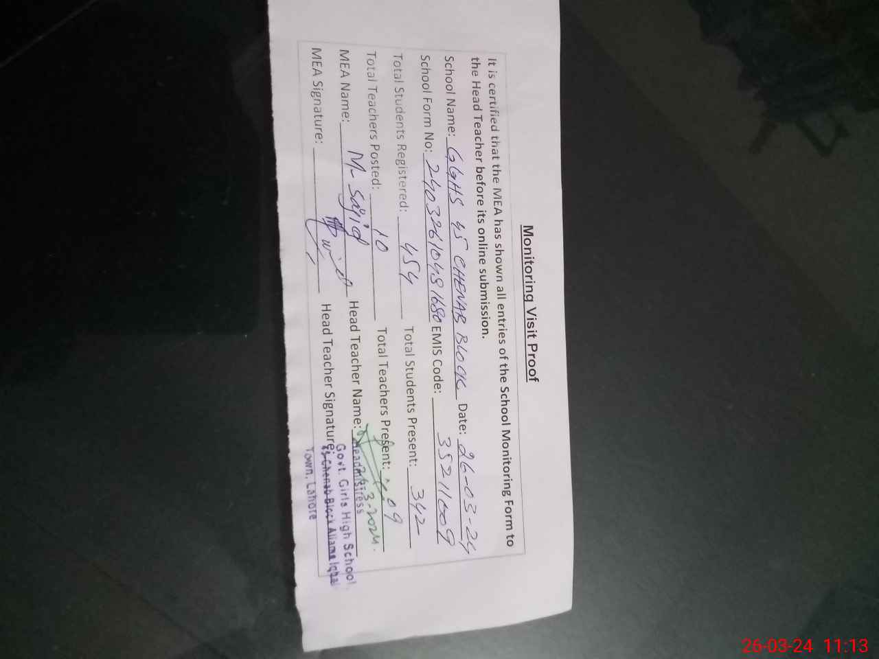 | Certified that this School was Inspected by the Undersigned MEA/DMO Today and the Information Stated Above is as Per Record. | |||||