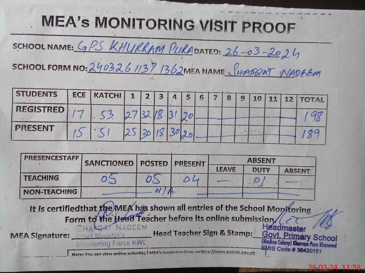 | EMIS Code: 36420151 | Name of School: GPS KHURRAM PURA, MADINA COLONY, KHANEWAL | |||