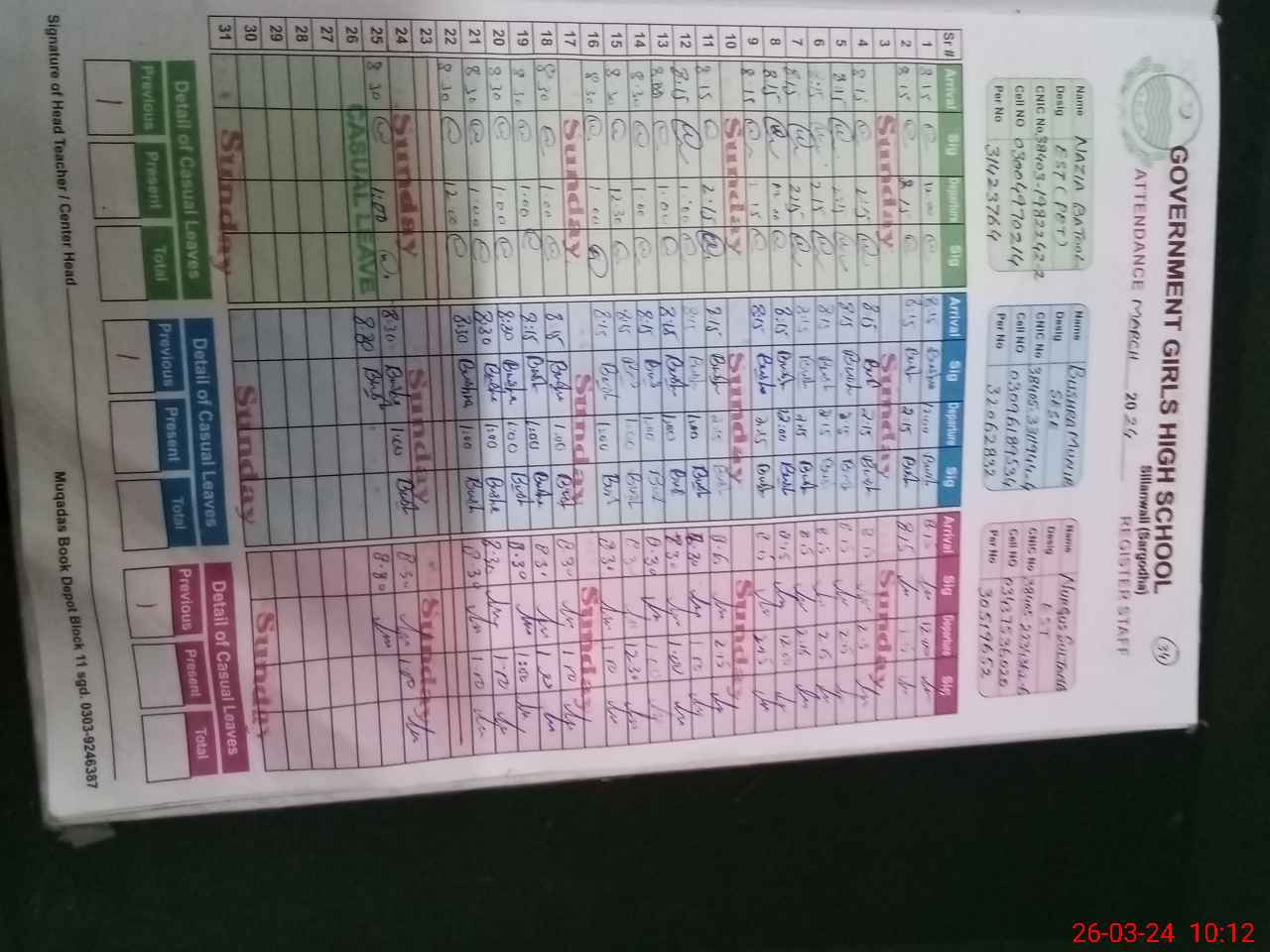 | CNIC | Full Name | Designation | R/C | Absence During Last Calender Month |