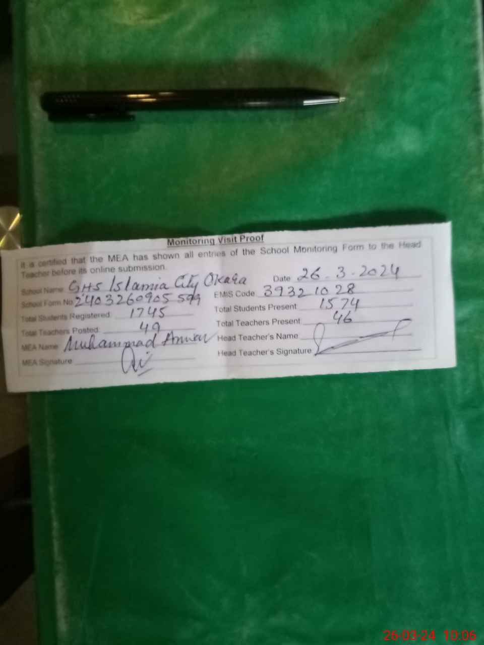 | EMIS Code: 39321028 | Name of School: GHS ISLAMIA OKARA CITY | |||